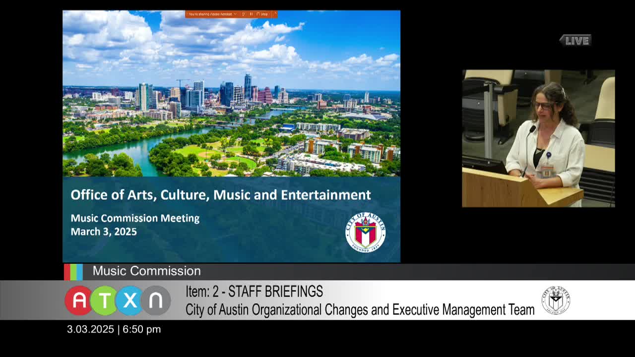 Austin city staff told the Music Commission that the newly formed Office of Arts, Culture, Music and Entertainment will consolidate staff and programs from multiple departments, with Director Angela Means and Music and Entertainment Division Manager Erica Shamley describing an initial community-engagement and strategic planning timeline.