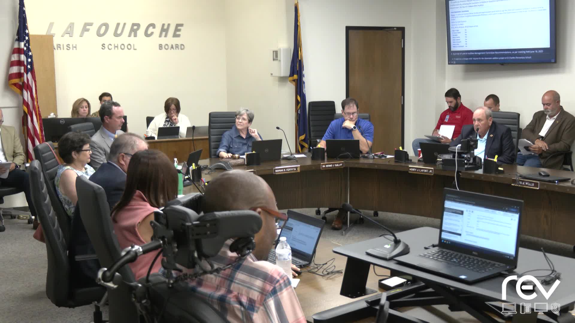 The Lafourche Parish School Board approved multiple land and facilities items including change orders, a fee waiver request for a youth basketball league, adoption of a revised student code of conduct for 2025–26, and new job descriptions.