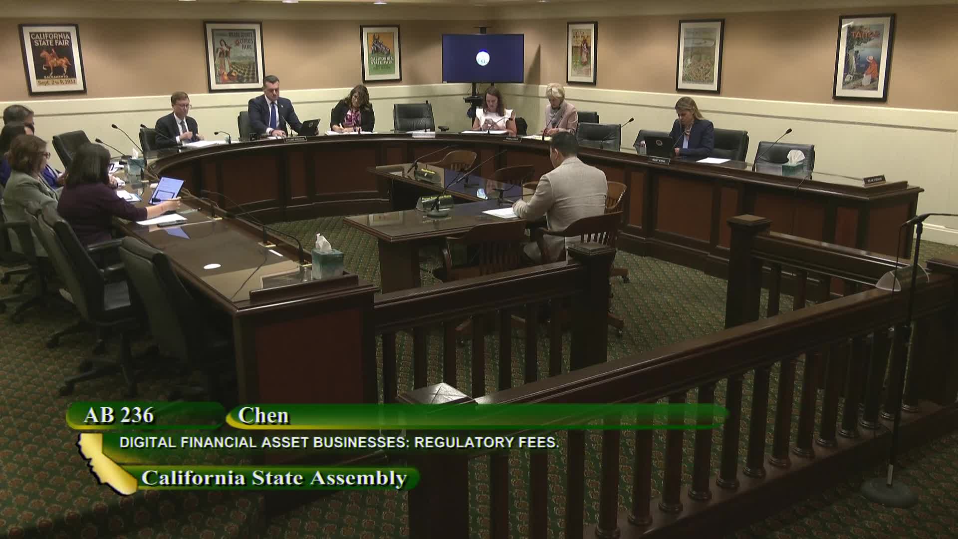 The Assembly Banking and Finance Committee voted 8-0 to pass AB 236 and referred the measure to the Assembly Appropriations Committee. The bill would modify licensing fee structure for firms engaging in digital financial asset business activities to make California more attractive for blockchain and digital asset companies.