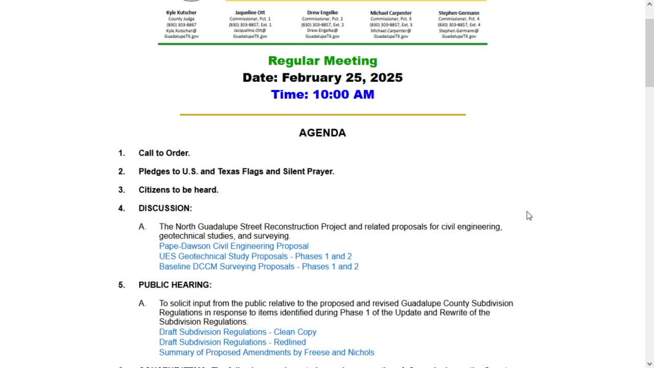 County officials reviewed engineering, geotechnical and survey proposals for a phased rebuild of North Guadalupe Street tied to the Emergency Operations Center project and other county facilities, and asked staff to return with refined construction cost estimates.