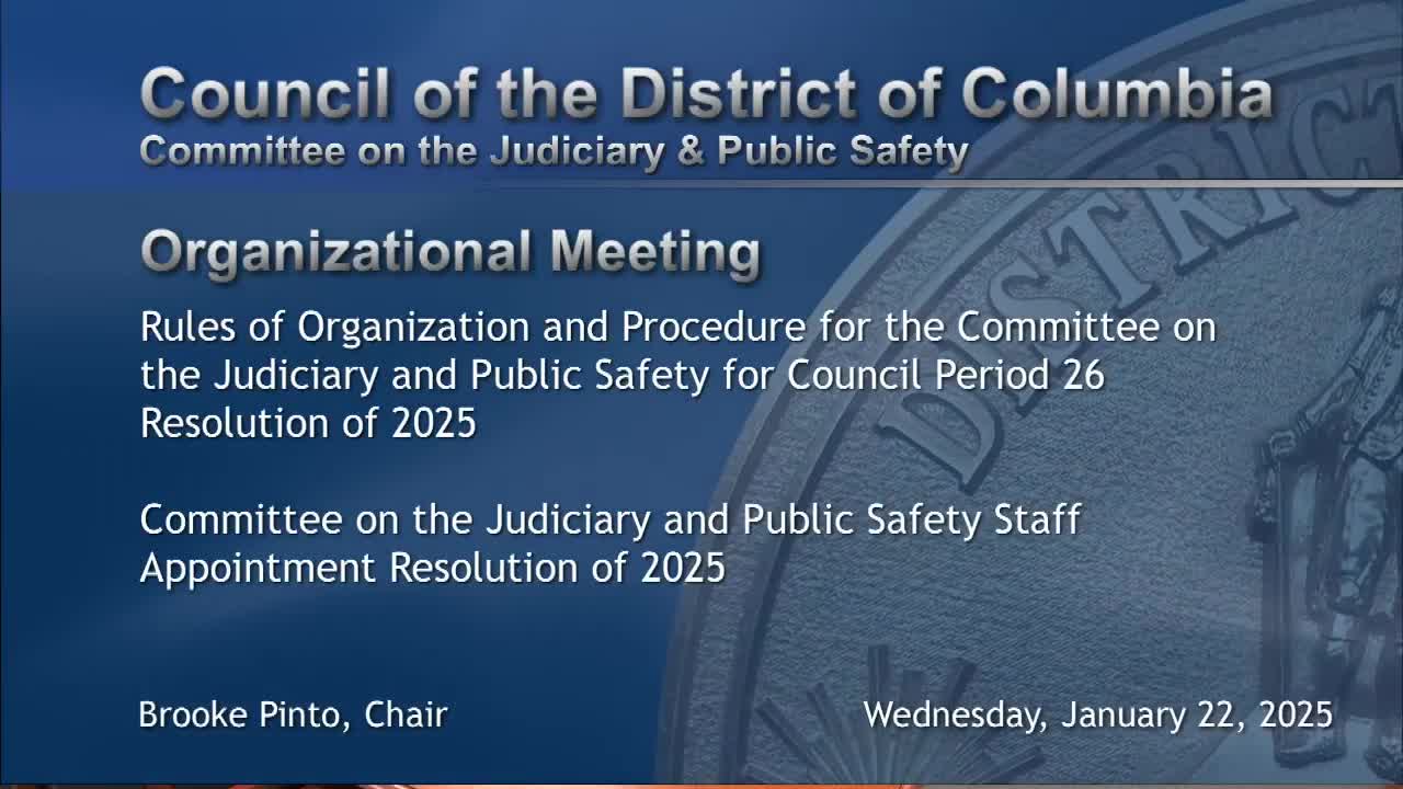 At its Jan. 22, 2025 organizational meeting, the Committee on Judiciary and Public Safety adopted its rules of procedure for council period 26 and unanimously approved five staff appointments. Chairwoman Brooke Pinto outlined public-safety priorities and cited recent crime reductions and forensic reaccreditation.