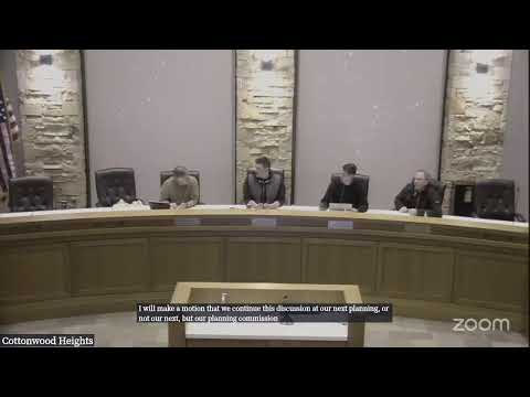 The Cottonwood Heights Planning Commission on Jan. 8 heard an informational presentation and public comment on ZTA24‑005, a text amendment to the site‑specific PDD‑2 Wasatch Rock Redevelopment Zone that would set height and unit counts for a condominium building at 6695 Wasatch Boulevard, and voted to continue the matter to Feb. 5 for further analysis.