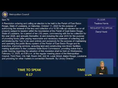 The East Baton Rouge Parish Library asked the Metro Council on Feb. 12 to place a renewal of a dedicated 10.5‑mill property tax before voters on Oct. 11, 2025, but the council did not complete action after hours of public comment and competing motions.