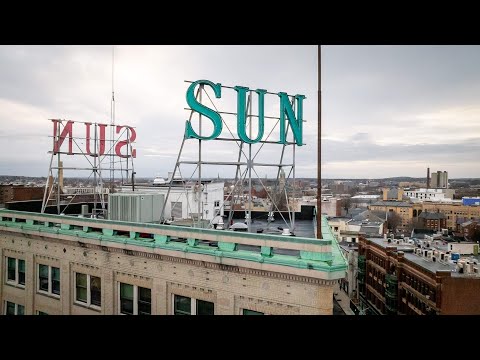 City and private partners celebrated the restoration and relighting of the twin Lowell Sun neon signs atop the Sun Building, a project begun in 2017 and paid in part with a $60,000 City of Lowell contribution and support from local foundations and contractors.