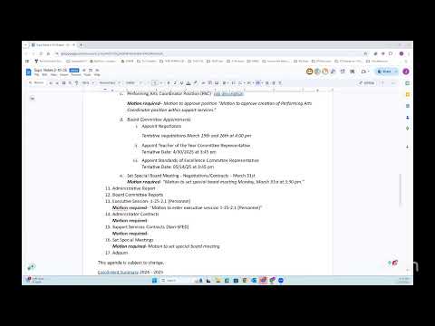 - Performing arts coordinator position: The board approved creating a performing arts coordinator position within Support Services, to be hourly and reported via time clock, with the position to start July 1; the motion passed unanimously.