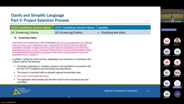 What staff presented: Anya Allenbaker, Active Transportation Program manager at the California Transportation Commission, said the revised guideline language would underscore that agencies should use applicable design standards (for example, Caltrans standards or local agency standards) when designing ATP-funded projects. The revisions call out Streets and Highways Code section 891.9 to reflect recently enacted law affecting Class 3 bikeways.