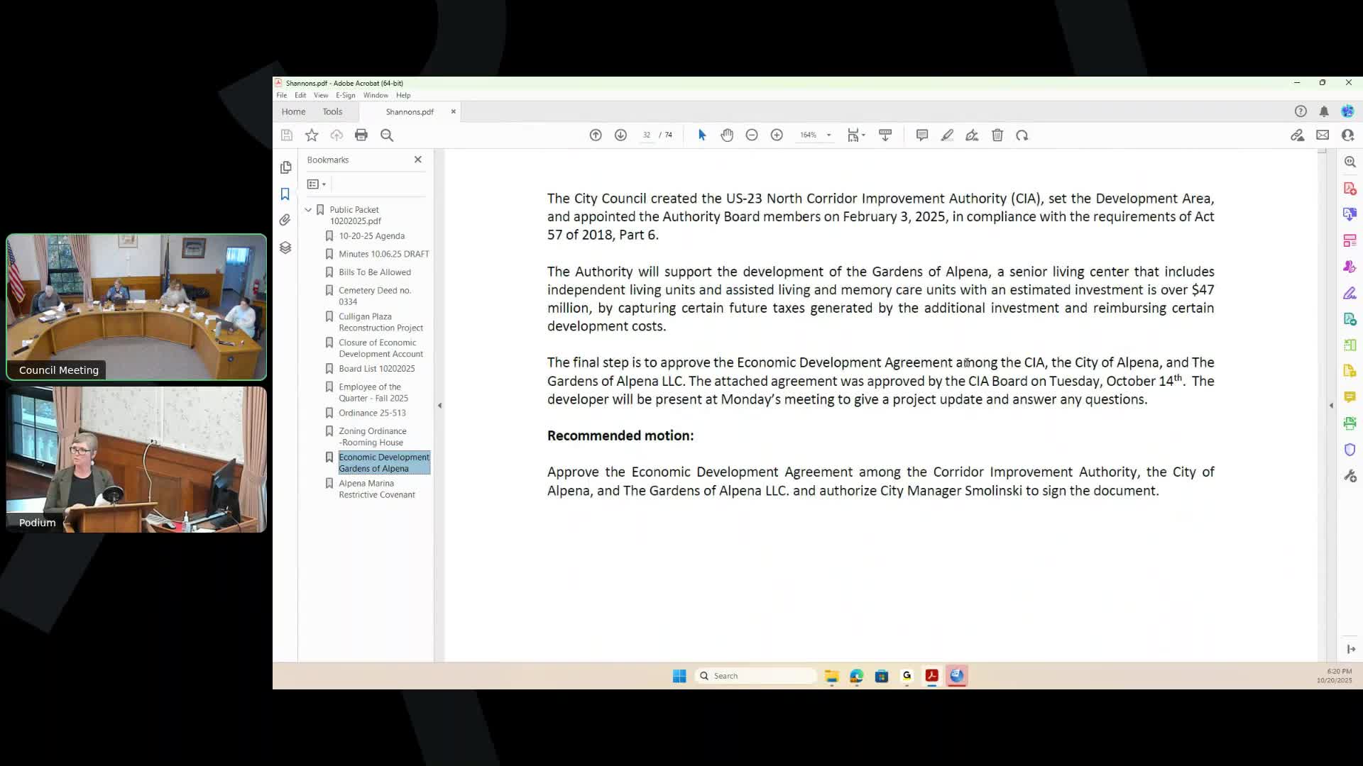 Council approved an economic development agreement among the US‑23 North Corridor Improvement Authority, the city and Gardens of Alpena LLC to support a senior living project estimated at more than $47 million and added language requiring a construction lender commitment letter before tree clearing.