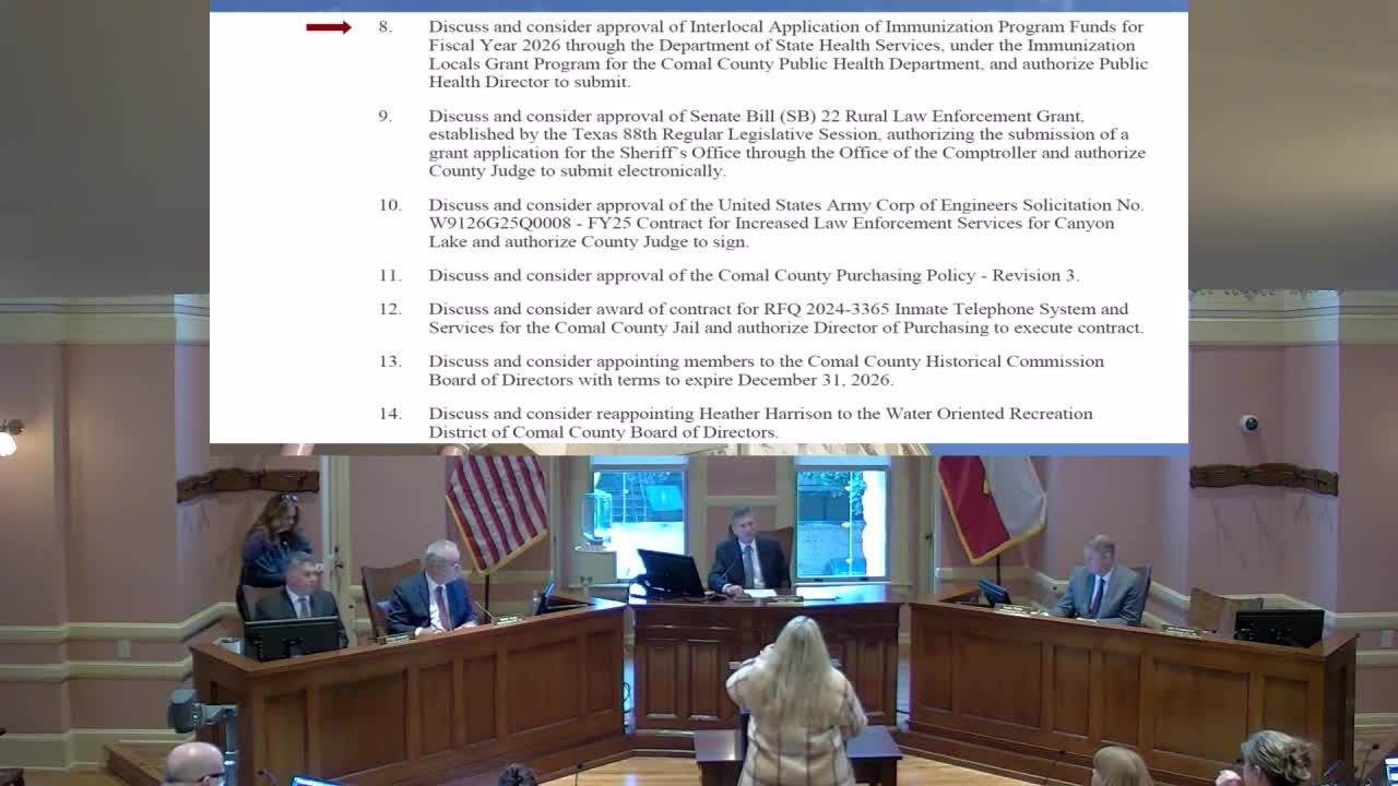 Why it matters: The immunization grant funds county public health staffing; SB22 funds would support sheriff—s salaries if awarded; the USACE contract funds law enforcement presence at Canyon Lake and reflects a partnership that reimburses the county for operational costs.
