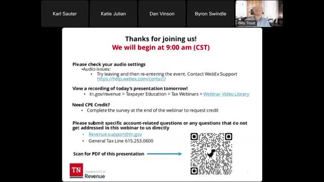 Technical resources and help Revenue staff pointed attendees to the Tennessee Taxpayer Access Point (TINTAP), certified MEF vendors and detailed guidance in the Department’s Franchise and Excise Tax Manual (the manual was identified as the primary line-by-line resource). Julian said webinar materials and a recording would be posted to Revenue’s webinar library and shared a PDF of the presentation. For individualized help, Revenue provided revenue.support@tn.gov and a phone number (615-253-0600).