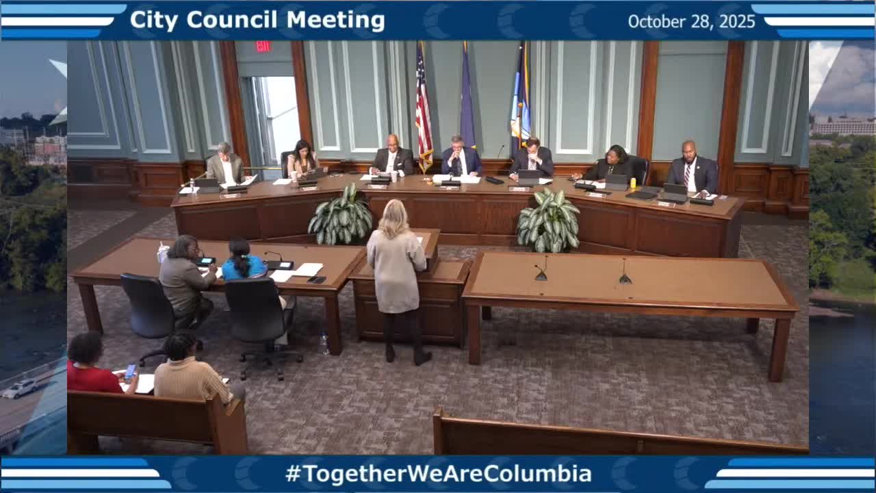 The Columbia City Council voted to adopt a major amendment to the Bull Street neighborhood plan development (item 12) after residents and council members raised traffic and tree-canopy concerns and urged a coordinated study of future growth. The measure passed on second reading by unanimous roll call.