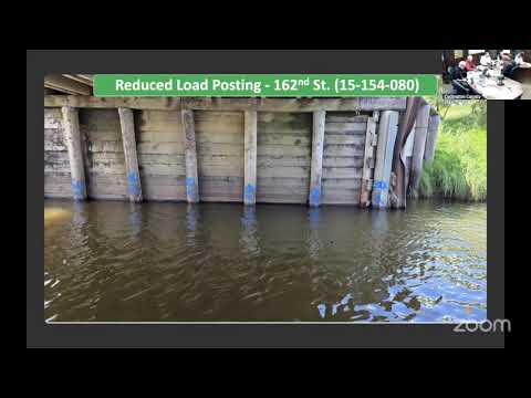 The presentation included recommended maintenance actions that county highway crews can perform, such as riprap (rock) replacement under vulnerable abutments, guardrail repair, and routine cleaning of steel and decks to prevent long-term deterioration. Banner credited the county highway shop for previous self-performed repairs and urged continued preventive work.