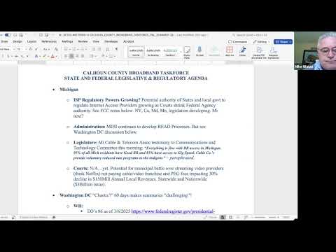 Telecom counsel Mike Watts gave a regulatory update that framed the county’s BEAD work against larger shifts at the federal and state level. He said several states (New York, California, Maryland and Minnesota) are pursuing ways to regulate ISPs and that recent court and administrative actions have weakened some federal agency authorities, creating openings for state regulation. "What their story is — everything's fine. 95% of all Michigan residents have good broadband accessibility. 85% have access to gig speed," Watts said, paraphrasing industry testimony to state lawmakers and illustrating how industry messaging may shape state policy responses.