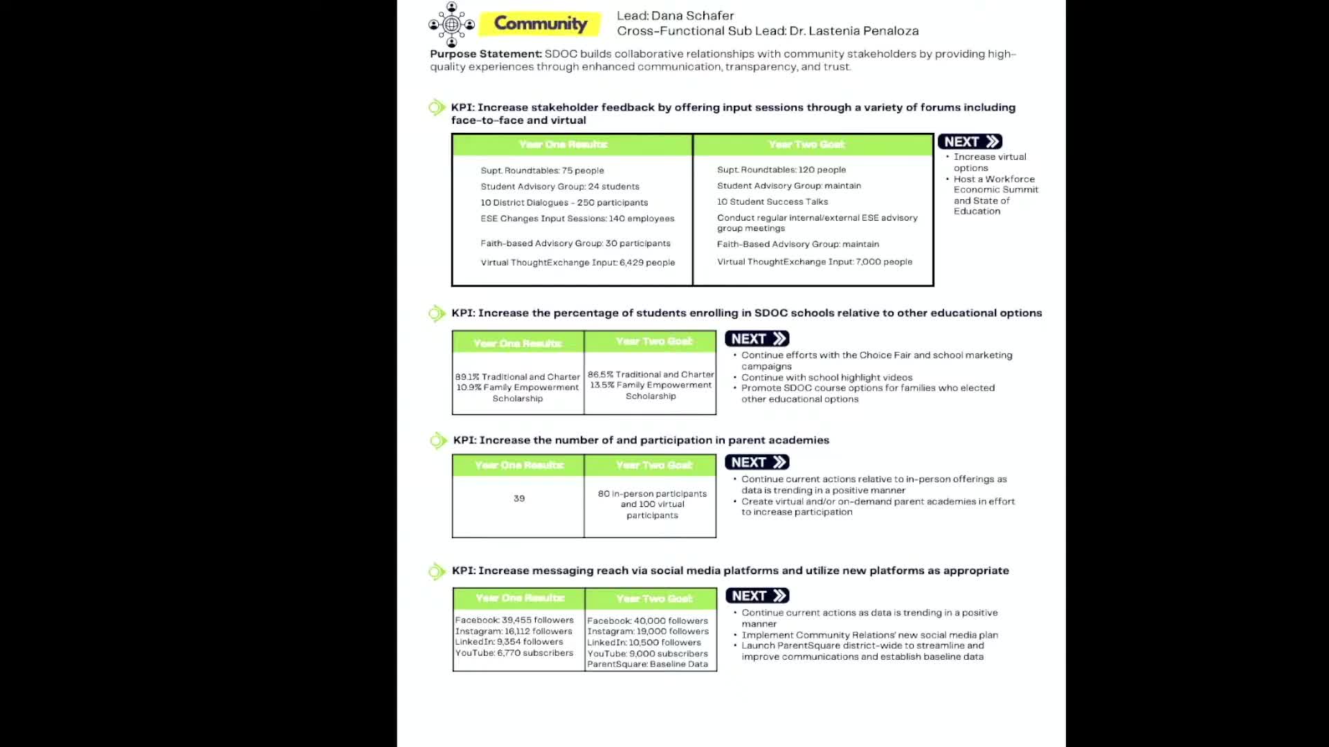 The communications team also outlined a social media schedule of regular content (weekly superintendent messages, classroom spotlights, attendance messaging and other themed posts) and said community relations is working with six schools targeted for communication support this year.