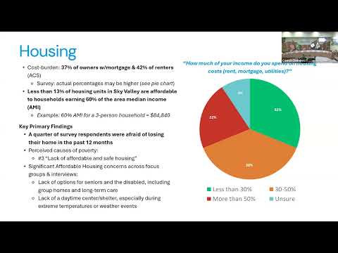 Quotes from the meeting: Caitlin summarized the scope and data sources and emphasized the prominence of housing as a top concern: "This assessment was first done in 2021... For our survey, we were able to include 289 responses." A member of the public commenting during Q&A said bluntly of youth mental-health findings, "Kinda disheartening. Kinda made me kinda sad. Eighth grader suicide."