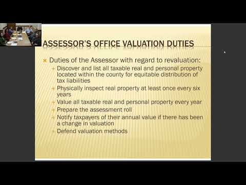 The assessor's presentation emphasized the office's connection to state oversight. According to the presenter, the Washington State Department of Revenue's property tax division issues guidance, reviews reevaluation plans and expects assessors to inspect property on a six‑year cycle; the presenter cited revaluation manual material and named RCWs and WACs as governing references. The office reported the county's latest revaluation plan was approved for the 2027 rule year (values as of Jan. 1, 2026 for taxes payable in 2027).