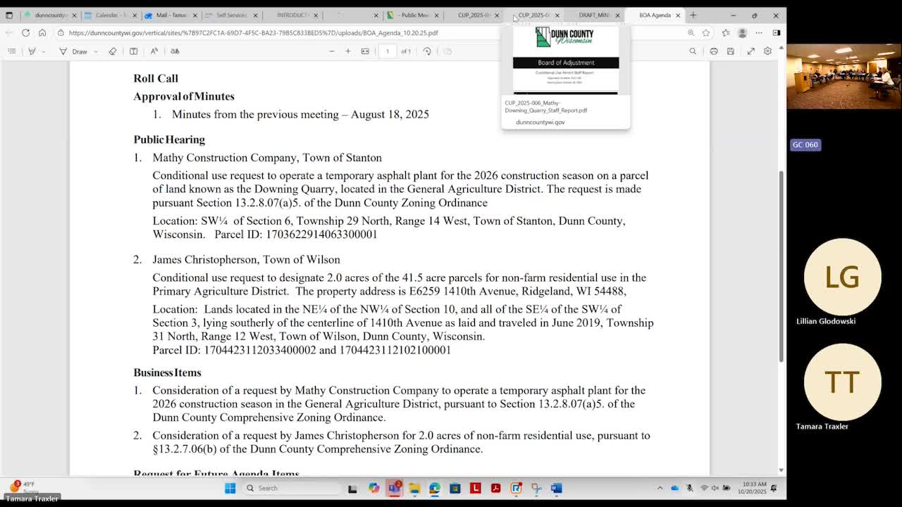 The Dunn County Board of Adjustment on Oct. 8 approved Mathey Construction’s request to operate a temporary asphalt plant at the Downing Quarry for the 2026 construction season, subject to conditions limiting plant production to 6 a.m. to 8 p.m. and requiring mitigation and notification measures.