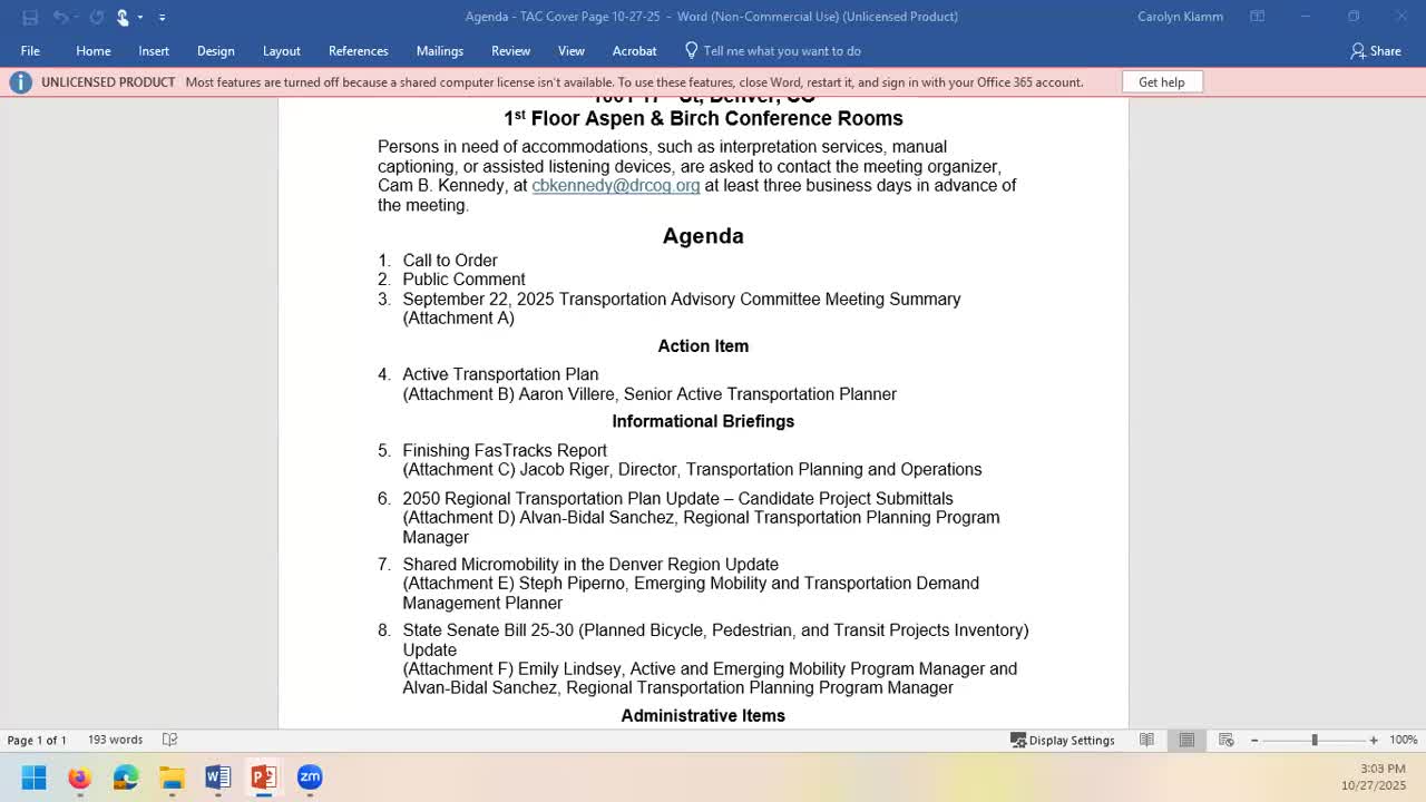 DRCOG staff on Oct. 27 described requirements and a submission process to meet Colorado Senate Bill 25-30, which asks metropolitan planning organizations to compile inventories of planned bicycle, pedestrian and transit projects.