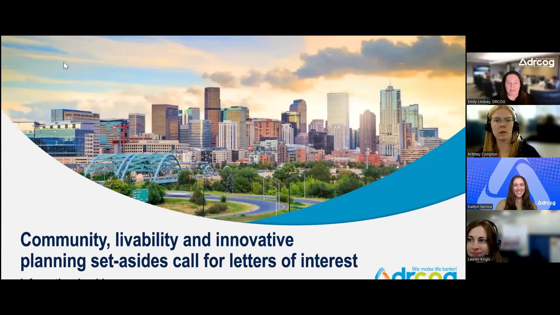 Contacts and materials: DRCOG staff named contact points for each set-aside during the webinar (Caitlin Service for livable centers; Britney and Lauren for community-based transportation planning; Emily Lindsey for innovative mobility) and posted an overview and application links on the DRCOG website. Letters of interest are due Nov. 15.