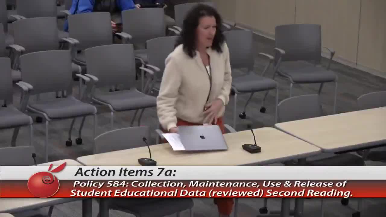 Associate Superintendent Mara Wyand presented Policy 5.84 (Collection, Maintenance, Use, and Release of Student Educational Data) as a second reading and reported no recommended revisions. Wyand said the policy, last revised in February 2023, is "in alignment with our state statute," and that a subcommittee is updating regulations to clarify directory information. The board moved, seconded and approved Policy 5.84 by voice vote. The meeting record shows a voice vote; the transcript does not include a roll‑call tally.
