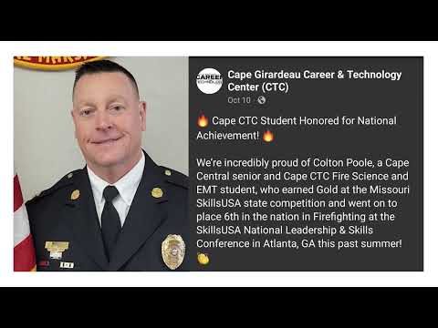 Thomas also said Missouri State Fire Marshal Tim Bean visited the Cape Girardeau Career and Technology Center to recognize Colton Poole, a Cape Center senior. Thomas reported that Poole placed sixth at the SkillsUSA National Firefighting competition and “took a gold at state.” Thomas said Poole plans to become a third-generation firefighter.