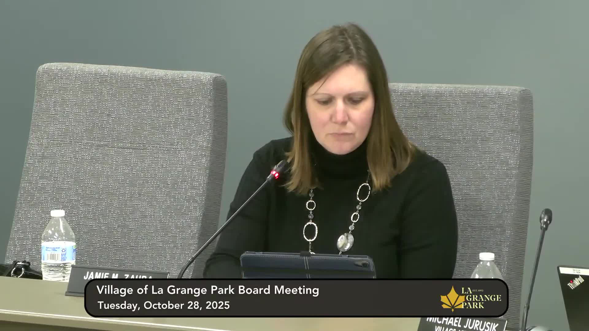 The La Grange Park Board of Trustees voted to approve an ordinance granting a front‑yard variation for a diesel backup generator to serve a wireless communications facility located at the Village Public Works property, 937 Barnsdale Road.
