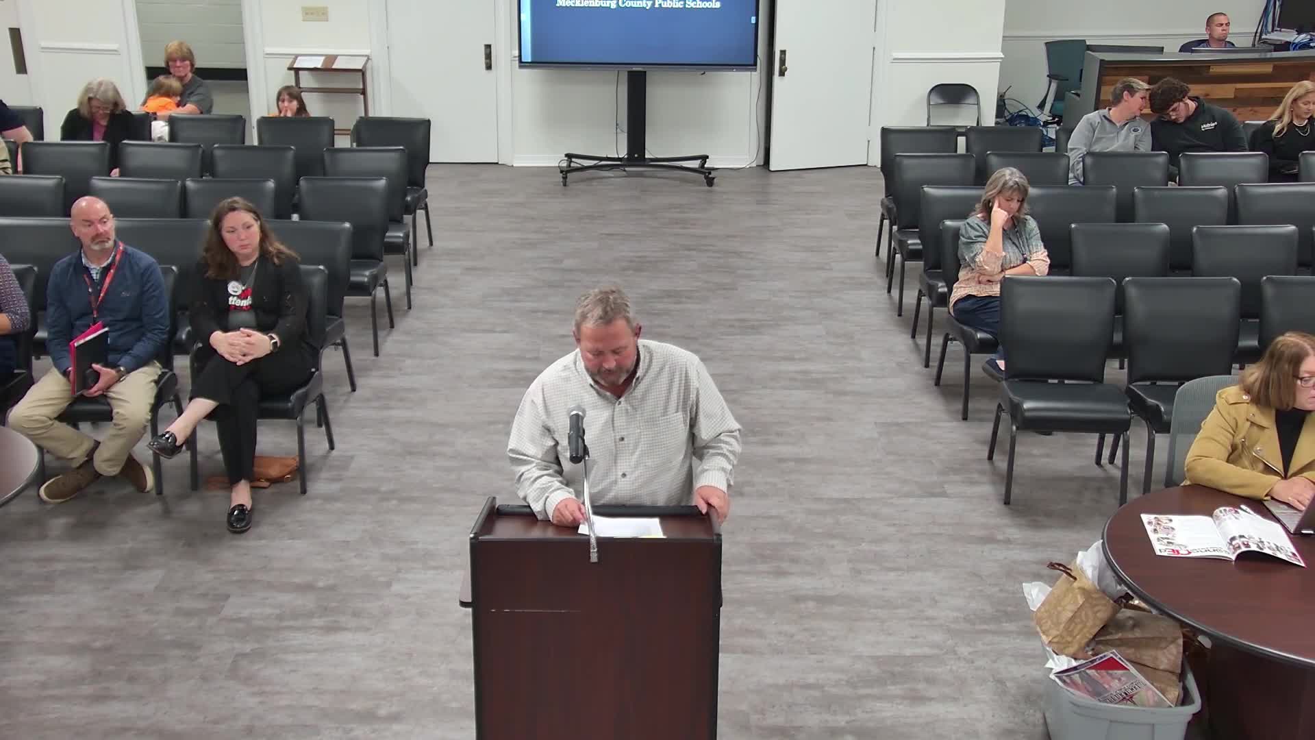 Items approved by recorded votes included the consent agenda, payment of bills recommended by the finance committee, two personnel recommendation packets (personnel 1 and personnel 2), appointments to the special education advisory committee, an overnight cross-country trip for Mecklenburg County High School athletes to a state championship in Leesburg (Nov. 7–8, 2025), and a motion to declare weight-lifting mats from the complex surplus for disposal or sale.