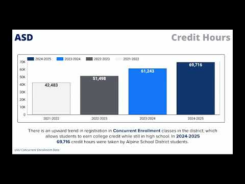 Superintendent Smith presented four-year data showing a steady increase in concurrent-enrollment participation across Alpine School District: 69,716 college credit hours earned last school year, an estimated $18,200,000 in tuition savings for families, and a passing rate near 98.5 percent among students who took concurrent courses.