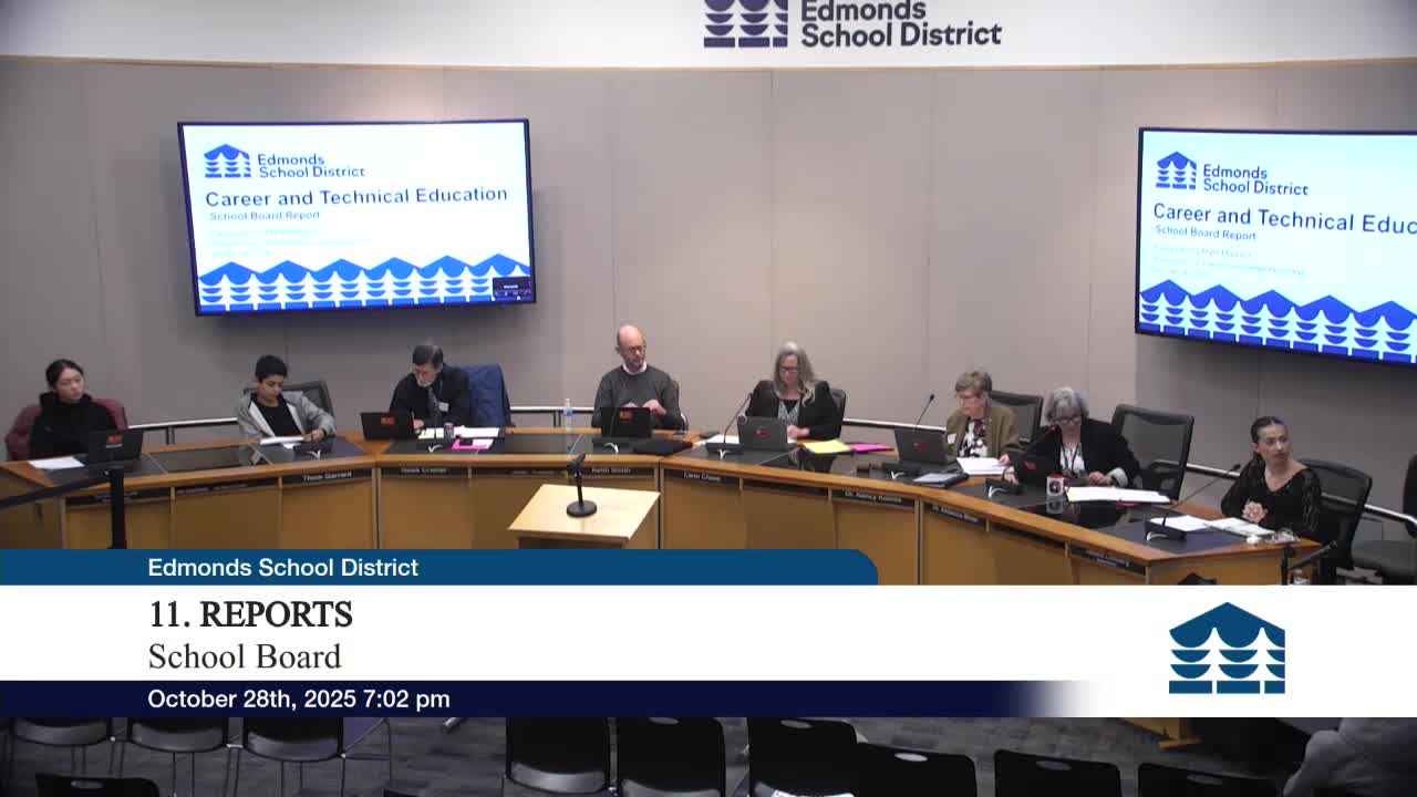 Mark Madison, Career and Technical Education (CTE) director for the Edmonds School District, briefed the board on the district’s CTE plan of work and introduced student presenters who shared their internship and program experiences.