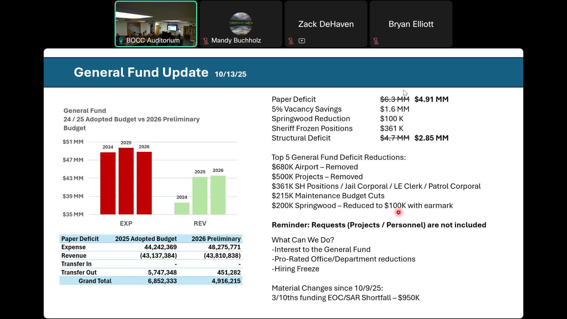 County budget staff said the countyfs "paper deficit is 4.91. With those same reductions, we're looking at $2.085," and outlined mitigation options including reallocating non-staff special revenue and internal service funds, prorated department reductions, and a potential hiring freeze. Staff said vacancy-savings estimates and additional detail would be provided at a subsequent study session.
