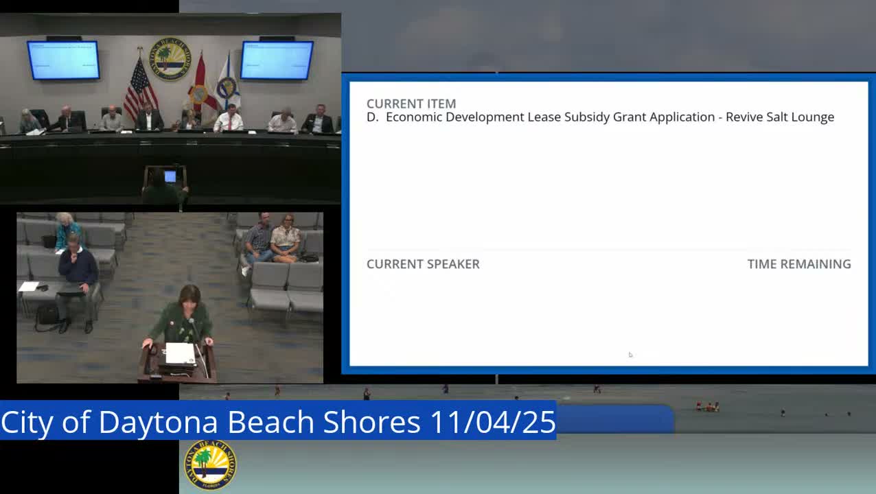 The commission reviewed a lease-subsidy grant application for Revive Salt Lounge (3624 S. Atlantic Ave.) after staff found the economic-development committee's recommended award did not follow the city ordinance's allowable schedule.