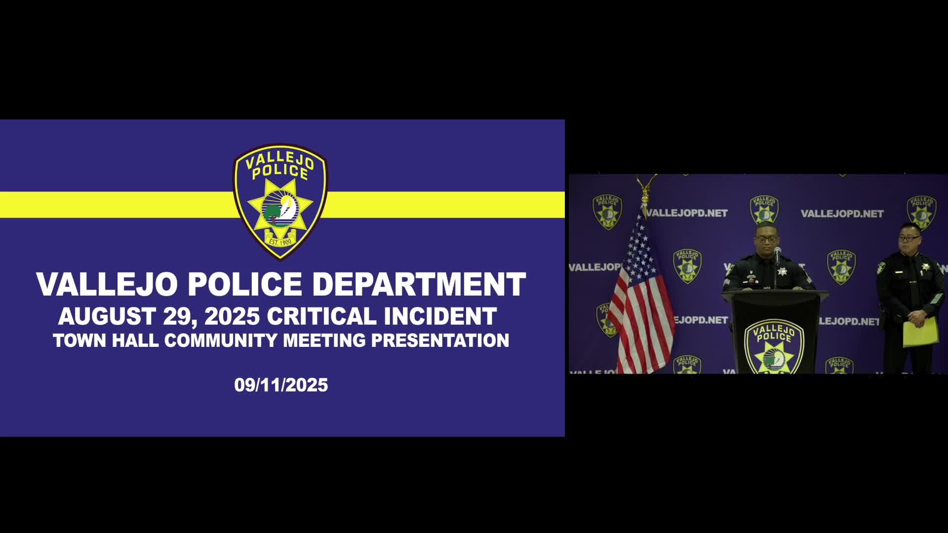 Sergeant Rashad Hollis, Vallejo Police Department public information officer and community engagement sergeant, opened the meeting and said the material shown was intended to share the facts available while the Solano County Major Crimes Task Force conducts the criminal investigation. “This meeting concerns an officer involved shooting that occurred on Friday, 08/29/2025 at 06:01PM at the Blue Rock Village Apartments,” Hollis said.