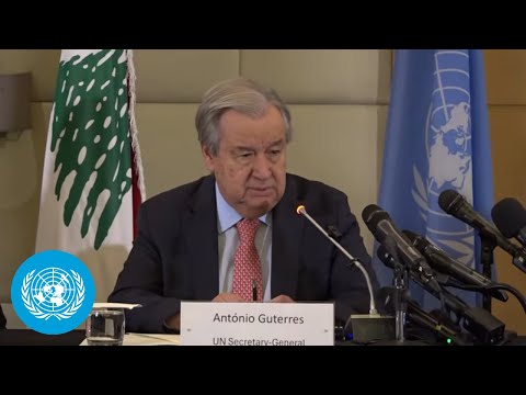 The Secretary‑General of the United Nations, speaking at a press conference during a visit to Lebanon, urged the full implementation of United Nations Security Council Resolution 1701 and renewed calls for a withdrawal of Israeli forces and the simultaneous deployment of the Lebanese Armed Forces across southern Lebanon.