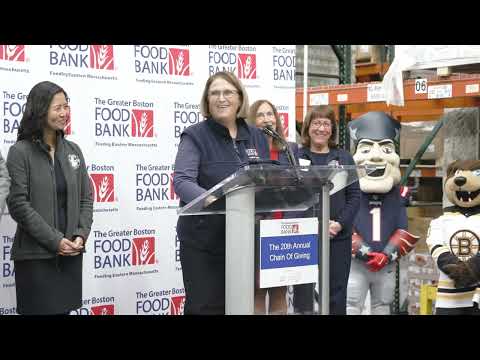 Cheryl Shondek, chief operating officer of the Greater Boston Food Bank, opened the 20th annual Chain of Giving at the food bank—s distribution warehouse and asked attendees to form a human chain to unload trucks.