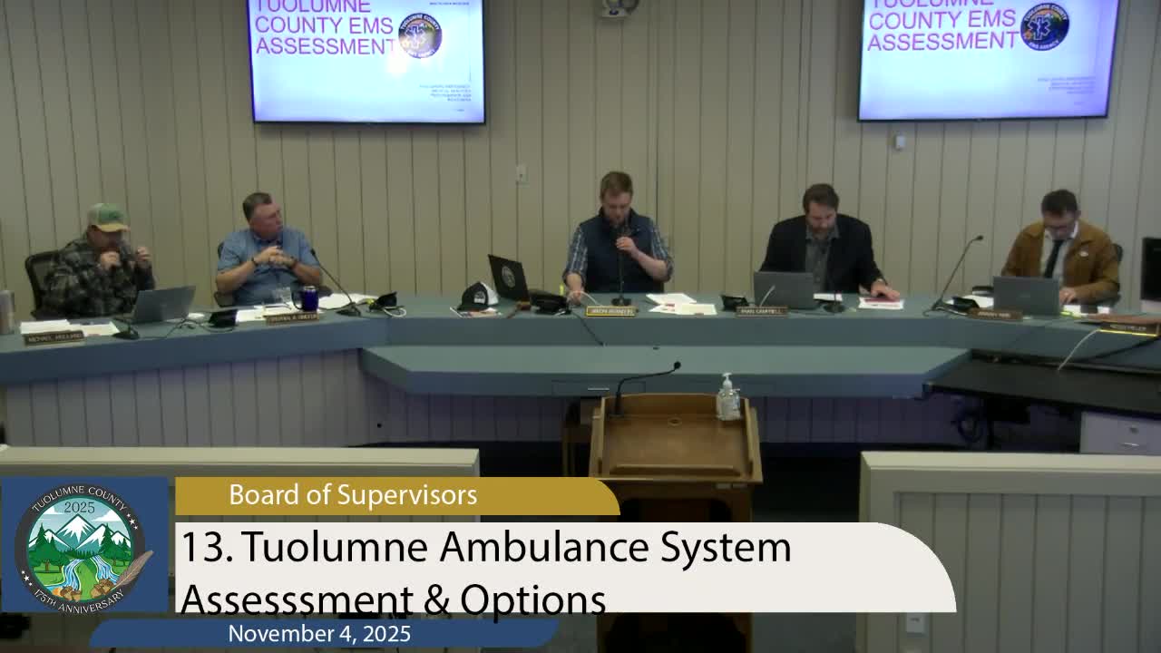 Consultants hired to assess Tuolumne County’s ambulance system recommended the county keep its existing hybrid public‑private model and seek a new provider through an open request for proposals, the Board of Supervisors decided Nov. 4.