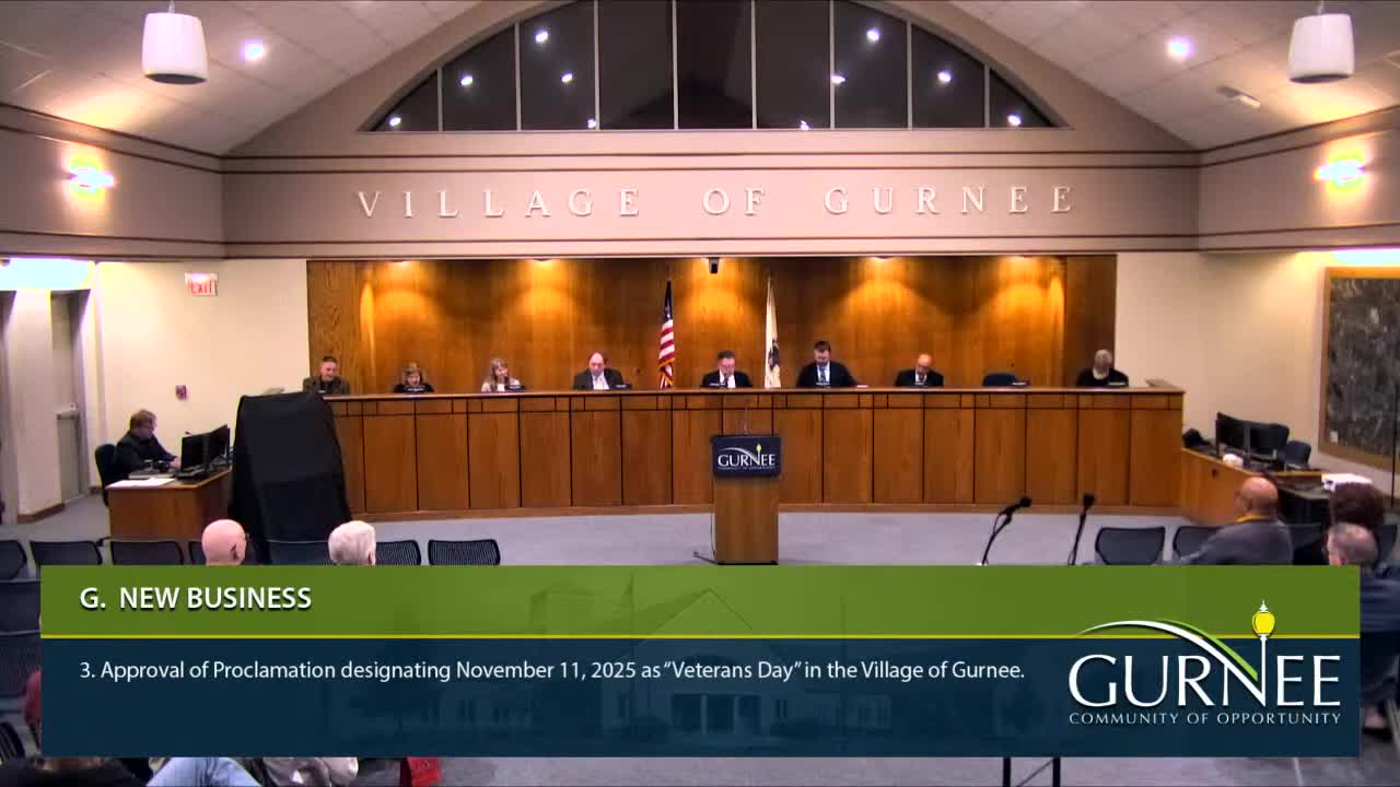 The Gurnee Village Board on Nov. 3 approved two proclamations: one designating Nov. 11, 2025 as Veterans Day in the village, and another designating Nov. 3, 2025 as Allen J. Lynch Day in honor of Lynch’s military service and post-service advocacy for veterans.