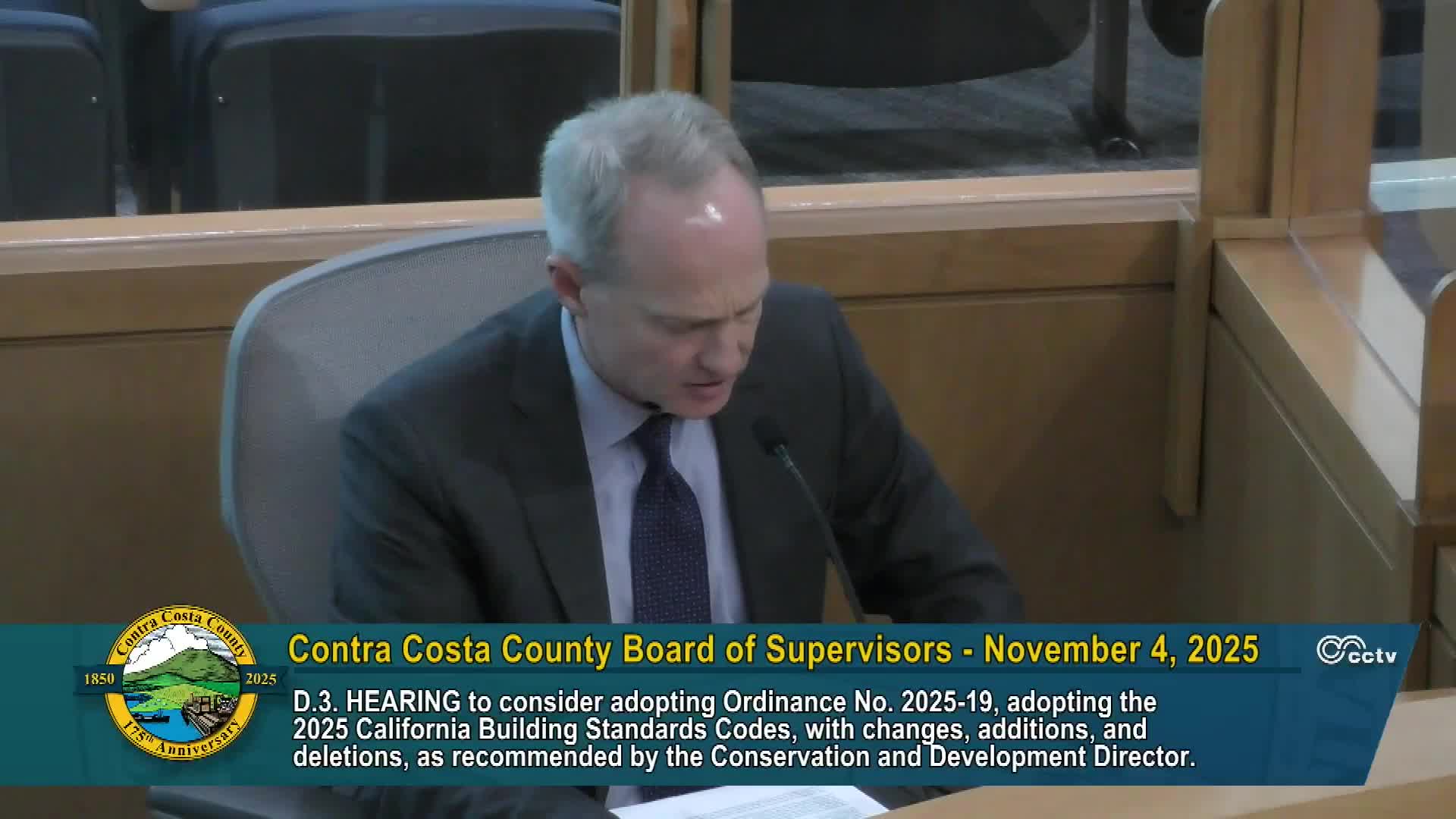 The Contra Costa County Board of Supervisors handled several administrative matters on Nov. 4, 2025, taking final action on agenda items affecting county operations, codes and planning.