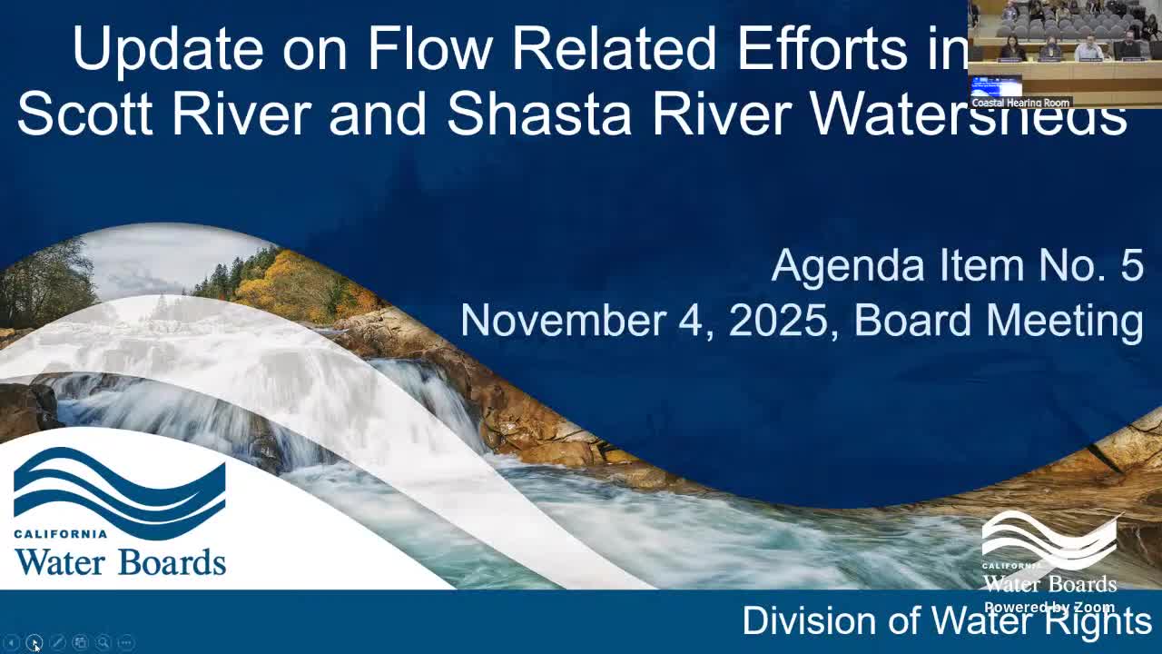 State Water Board staff on Nov. 4 laid out a multi‑year program of scientific and economic work intended to underpin permanent in‑stream flow protections for the Scott and Shasta River watersheds, while California Department of Fish and Wildlife (CDFW) and local stakeholders described monitoring results, local studies and implementation lessons.