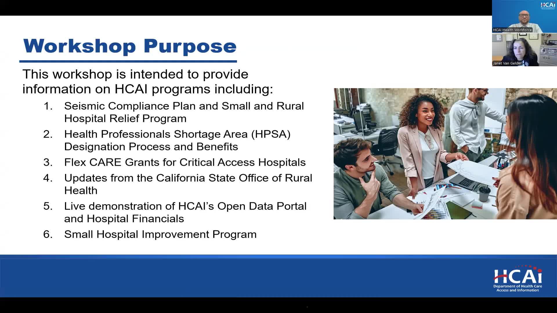 HCAI and OSHPD walked rural and critical access hospitals through new Seismic Compliance Plan requirements, AB 869 delay eligibility and the Small and Rural Hospital Relief Program reimbursement grants, and offered one-on-one technical assistance to limit project scope and cost.