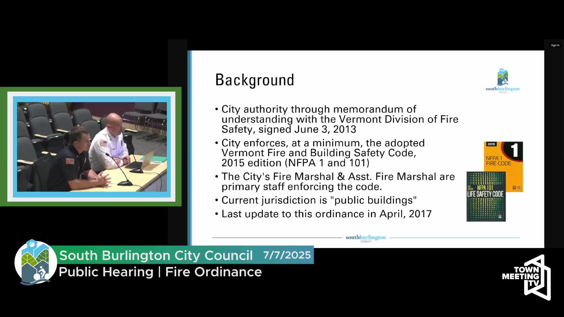 Corbin said the changes mirror the city's existing memorandum of understanding (MOU) with the Vermont Division of Fire Safety, which allows municipalities to perform code enforcement for public buildings; the MOU and the city approach now allow additional local enforcement of single-family work when the municipality chooses. Corbin told the council the change "will not require increase in staffing from the fire marshal's office to fulfill" the new scope.