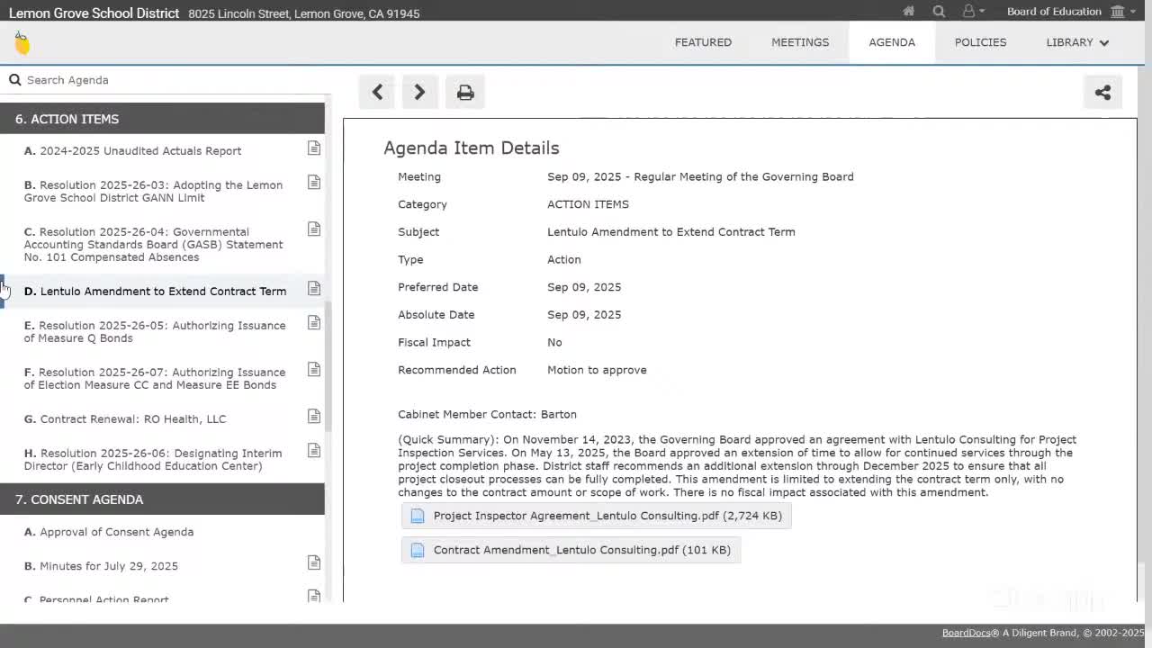 On Sept. 9 the Lemon Grove School District board approved a set of routine contract and personnel items as part of the meeting's action agenda and consent calendar.