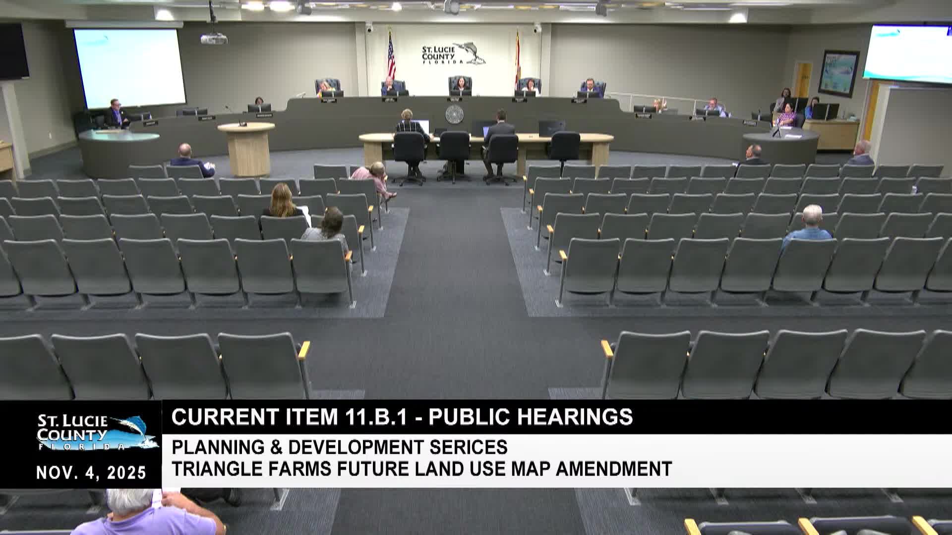 ST. LUCIE COUNTY, Fla. — The Board of County Commissioners continued to Dec. 2 a first-reading consideration of a proposed future land-use map amendment known as Triangle Farms, which would change roughly 88.7 acres from Agricultural-5 to a mixed-use designation with subarea policies.