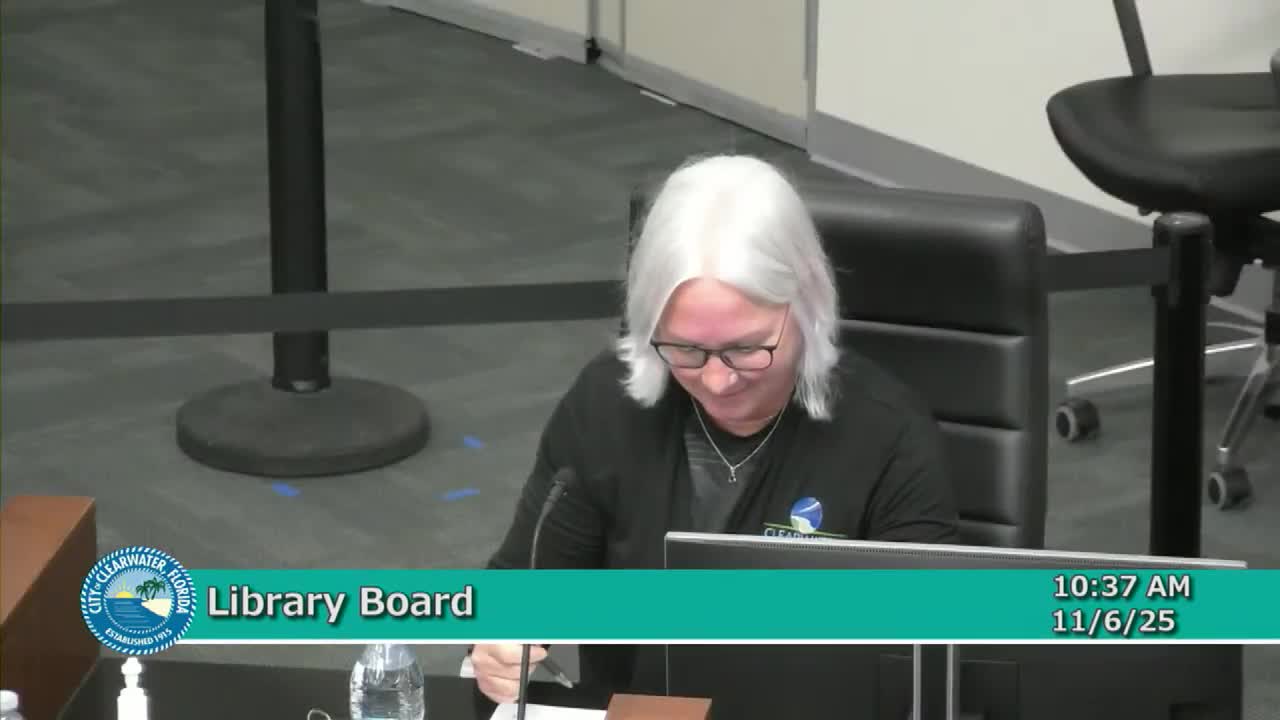Jennifer Obermeyer, Clearwater's library director, reported that the adopted FY2026 city budget included an 8% reduction to the library that required hour and position adjustments and outlined operational updates including a Beach branch pop-up, a North Greenwood mural and vendor disruptions.