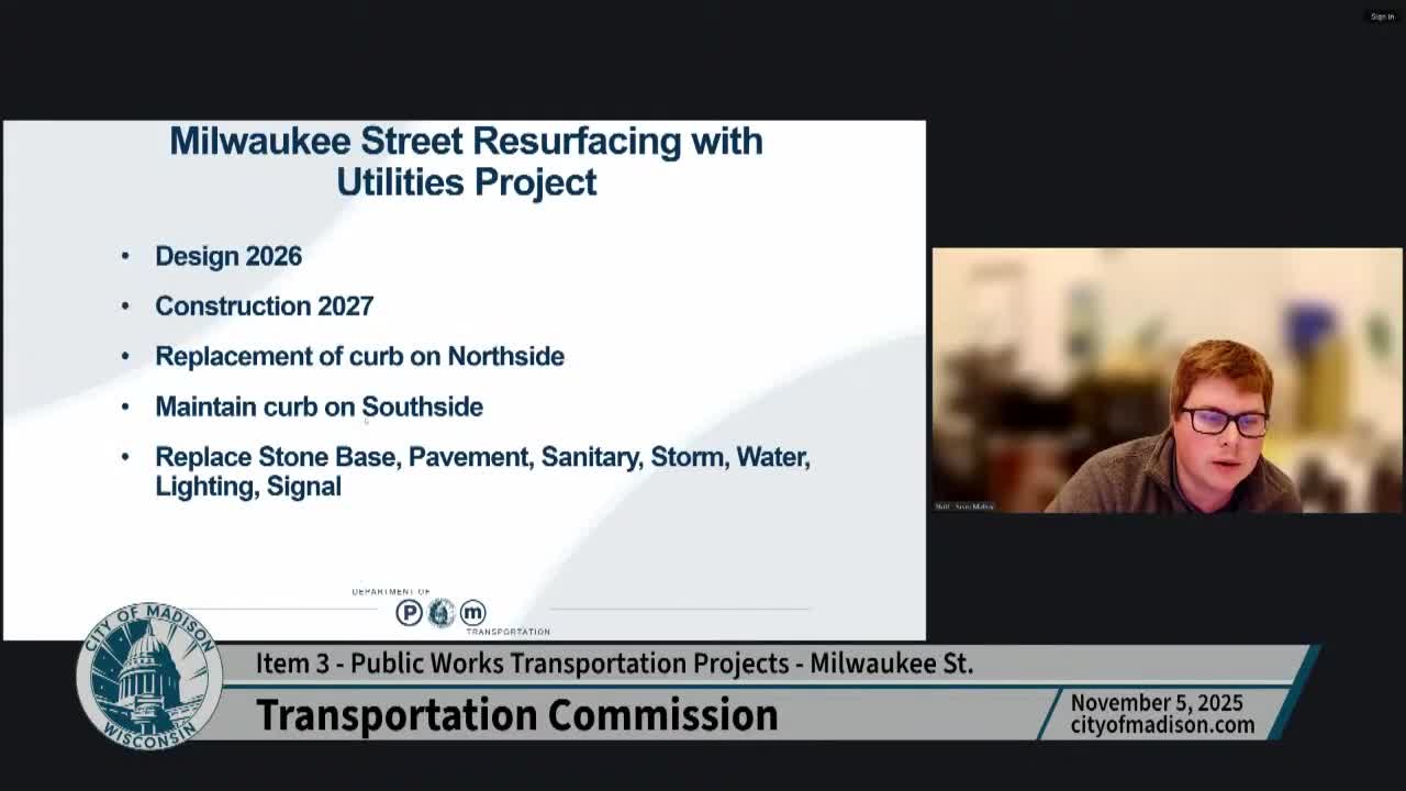 Engineering staff presented two cross‑section options for Milwaukee Street — a twiddle/two‑way left‑turn lane with a north‑side path versus a four‑lane divided section — and commissioners and neighbors pushed for a median or other measures that favor pedestrians, cyclists and long‑standing small businesses over expanded vehicular capacity.