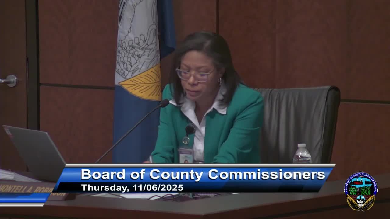 At its Nov. 6 meeting, the Forsyth County Board of Commissioners approved multiple budget and procurement measures including fleet vehicle purchases, a DWI interlocal payment, airport capital projects funded by FAA/NCDOT grants, and contracts for vehicles and building services. Most votes were unanimous.