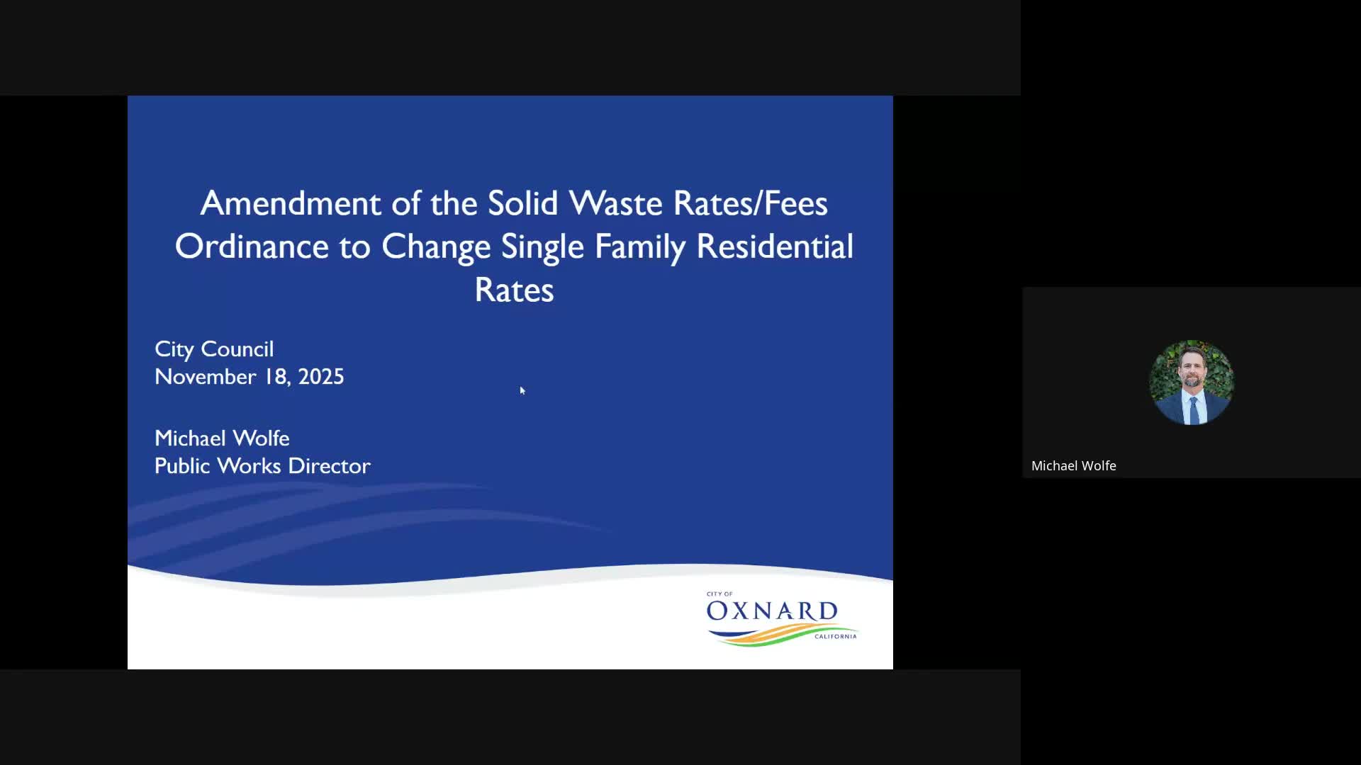 Michael Wolf, director of public works for the City of Oxnard, recommended the City Council approve the first reading by title only and waive further reading of an ordinance to remove an infrastructure use fee (IUF) component from the city's single-family residential solid waste rates.