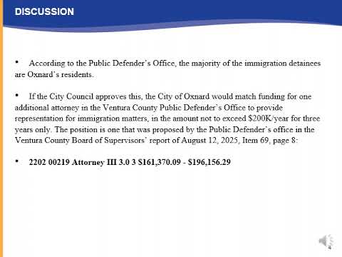 Nguyen said the Ventura County Public Defender's Office proposed staffing to provide immigration representation earlier in the summer but that proposal had not been funded by the county. "The majority of the immigration detainees are Oxnard residents," Nguyen said, citing the public defender's office. He said the city's match would fund one of the positions listed in the county staff report (Aug. 12, 2025, item 69), specifically an "attorney 3" level position shown on page 8 of the staff report.