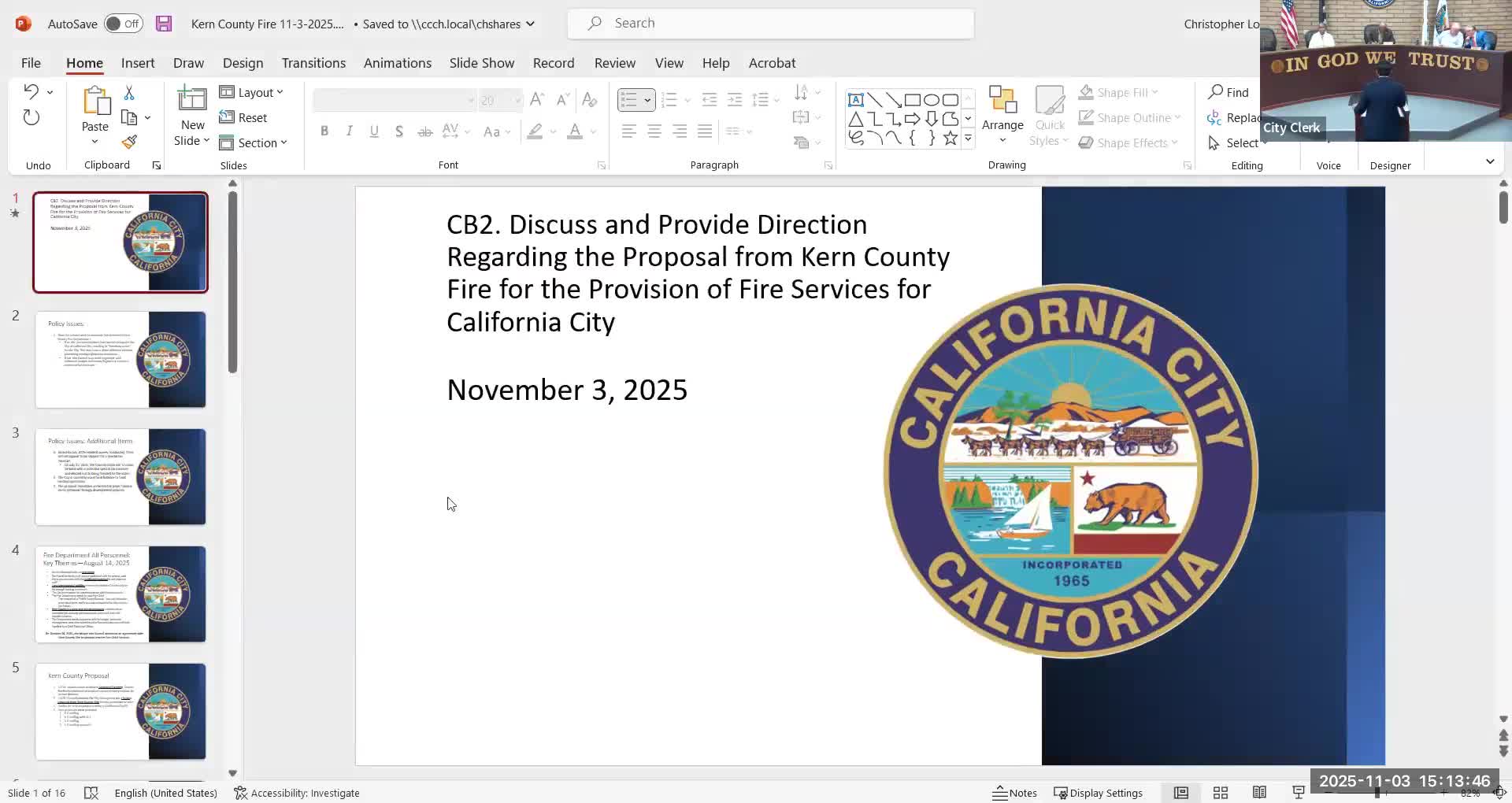 The California City Council voted unanimously on Nov. 3, 2025, to direct staff to formally begin contract negotiations with Kern County Fire for the provision of fire services in California City and to meet and confer under the Meyers-Milias-Brown Act, selecting Proposal A for negotiations.