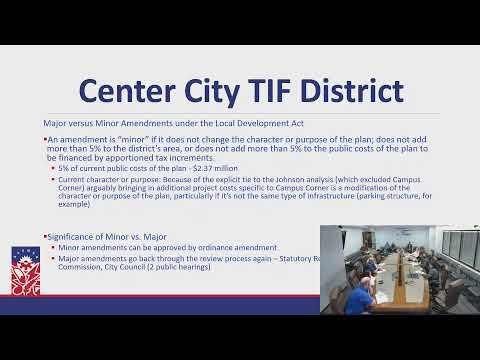 "The form based code was adopted in 2017 and the campus corner area was not included," Miss Walker told the committee, explaining that the Center City TIF boundary already includes Campus Corner but the project plan and the Johnson & Associates infrastructure study that underpins it do not allocate project dollars to parking structures. "The total for this particular TIF is $47,400,000," she said, and added that those dollars were tightly tied to public infrastructure upgrades identified in the original analysis (sewer, water, storm lines and street improvements).