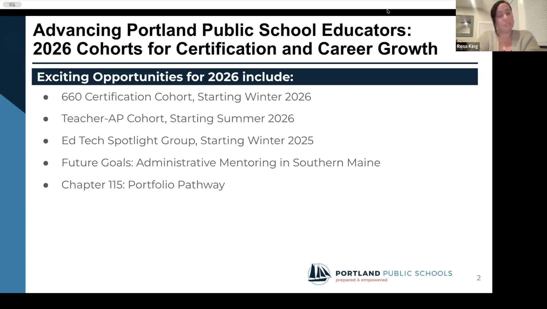 Rosa King, a district staff member, presented a package of workforce-development initiatives including a January 6-60 ESOL cohort, a summer 2026 teacher-to-AP leadership pathway, an EdTech peer group and a proposed Chapter 115 portfolio certification route.