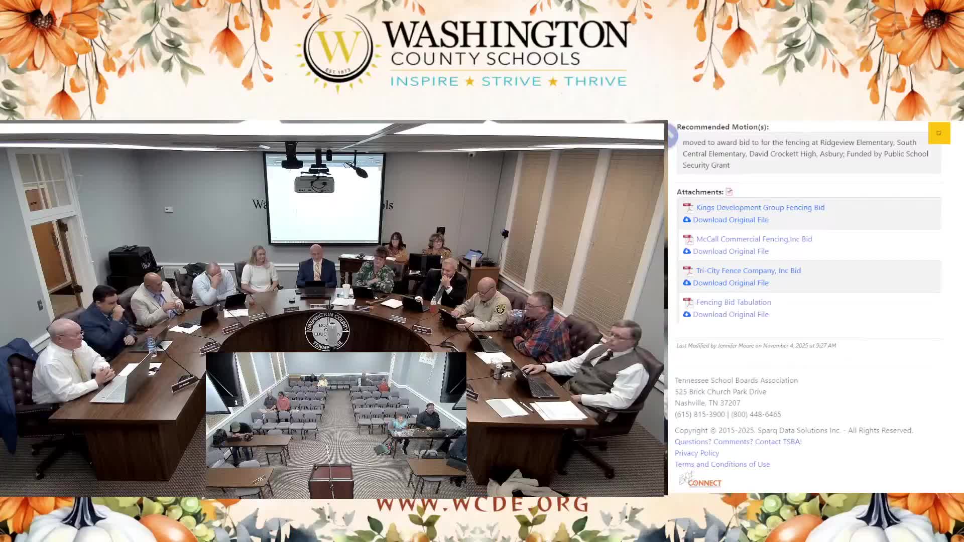 The Washington County Board of Education voted to award a fencing contract to Kings Development Group, approved multiple school purchase orders and an overnight student trip for David Crockett High School, and agreed to table a garage roof repair item for further review in a workshop.